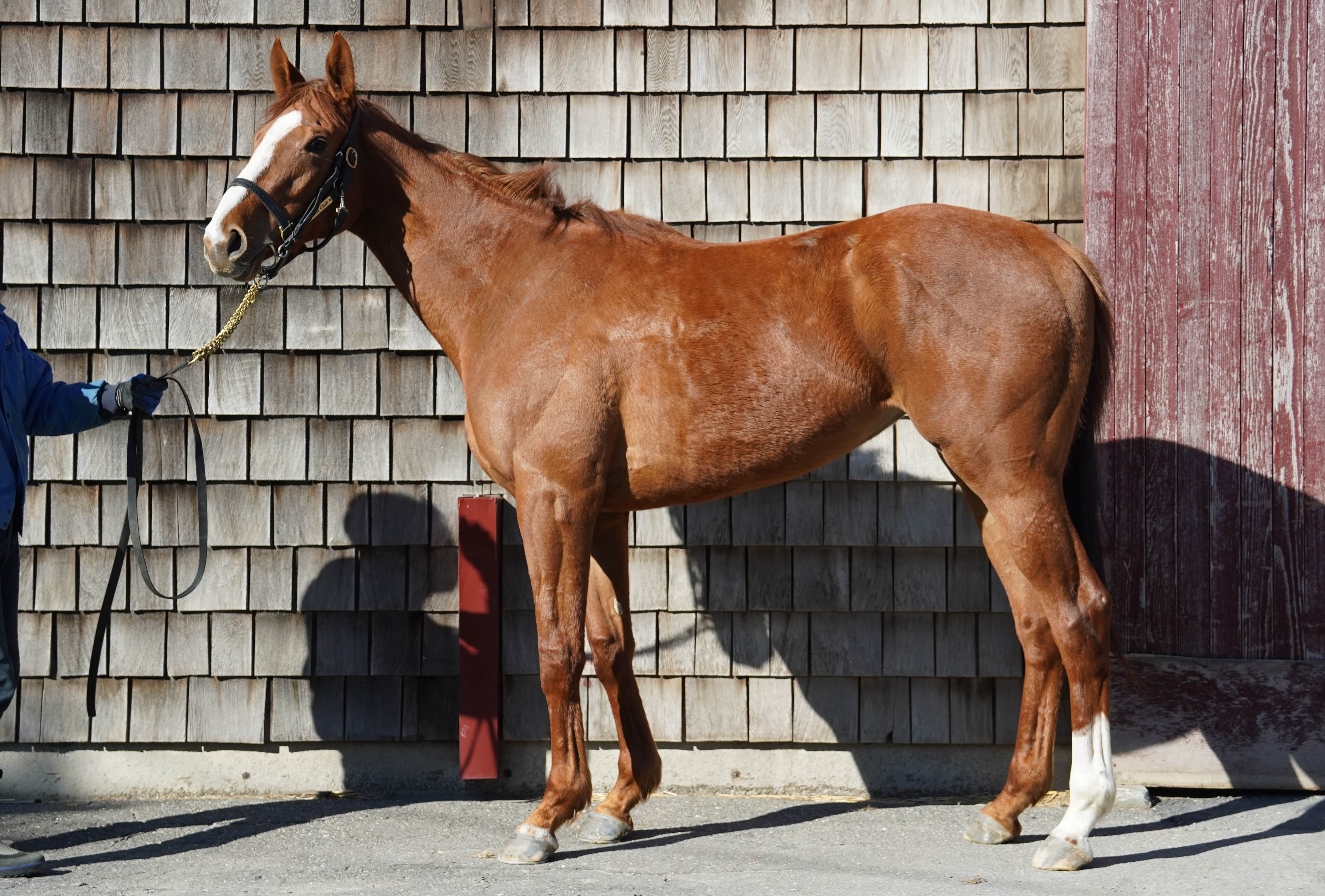 宇治田原:木曜日にこちらに到着しております。到着時の馬体重は478kgです。 脚元、馬体に問題はありませんが、飼い葉の食いがあまり良くないので2日程様子を見て行きたいと思います。 問題がなければ週明けから乗り始める予定です。 本日金曜日はウォーキングマシン60分の運動をさせています。