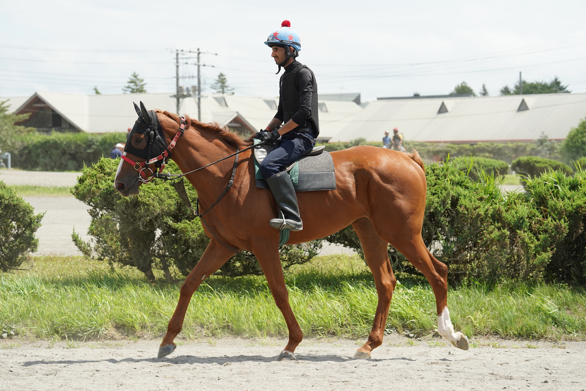 ファンタストクラブ:暑さが厳しいことと、ウッドチップコースのコンディションもあまり良くないこともあって、火曜・金曜共に屋内ダート坂路での調教として短い距離で負荷をかけて行きました。両日とも20-18/Fの単走を1本行い、2本目は15/Fの併走で登坂させました。 それ以外の日は屋内ダートコースを3〜4周を20〜18/F程度のキャンターで乗り進めております。 今日は現時点でどの程度動けるかを確認するために2本目を15/Fから終いをできるだけ伸ばしていくよう指示しました。 パワーがついてきてまずまずの動きはできていたと思います。まだ前肢頼りになるところも見られますが、以前よりもしっかり後肢を使えるようになっていると思います。 体幹も以前よりもしっかりしてきましたので、もう少し負荷をかけながら進めて行きたいと思います。暑さにもへこたれずに元気いっぱいに調教ができていますので、これを継続できるように進めたいと思います。