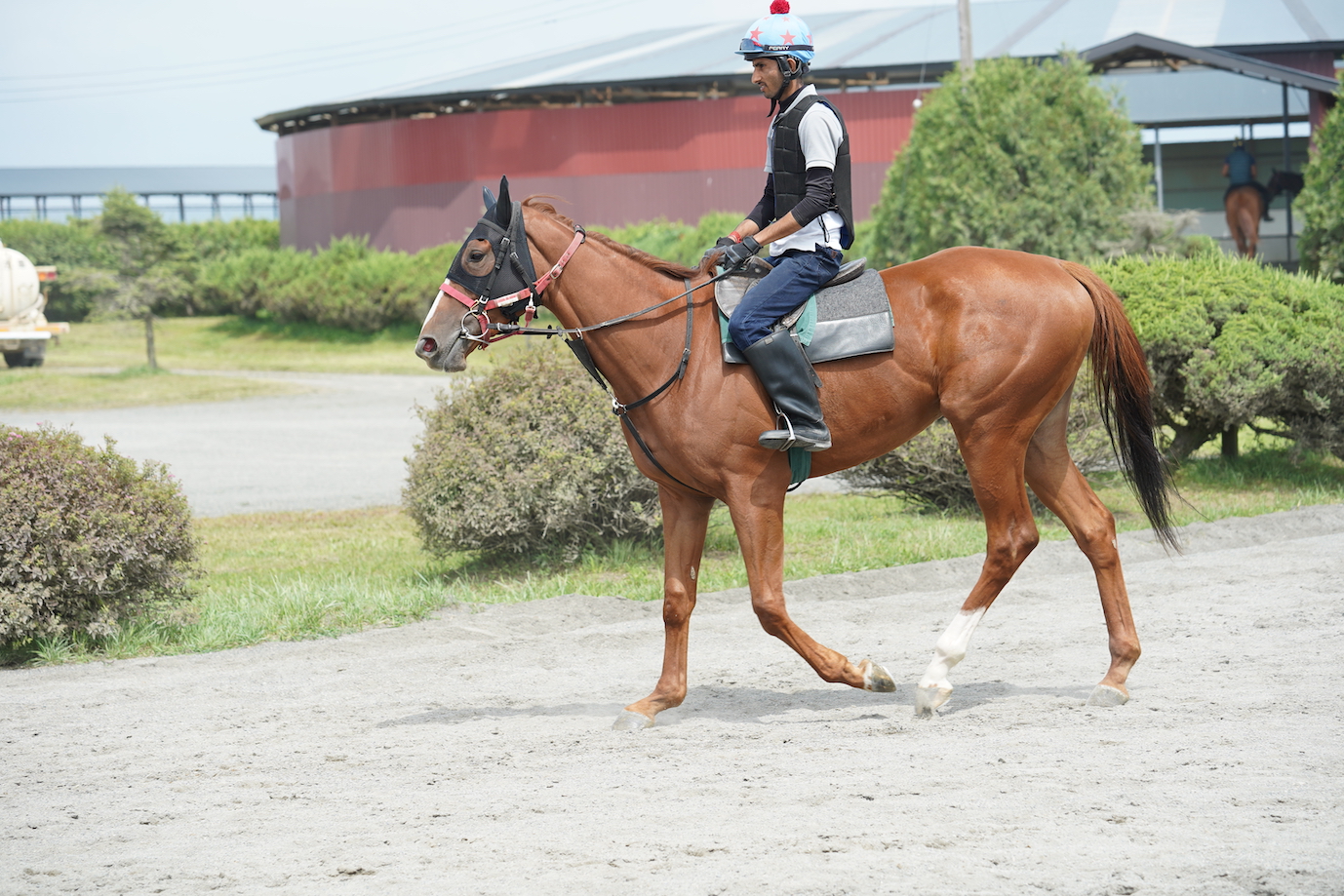 ファンタストクラブ:今週火曜は、屋内ダートコースを17〜18/Fのキャンター3周後に屋内ダート坂路を単走で15-13の指示で進めました。金曜は雨予報だったため、木曜にウッドチップ坂路を17/Fで登坂させた後、屋内ダートコースで15-13/Fの指示で行けるところからスピードを上げるよう指示しました。 それ以外の日は屋内ダートコースを18〜20/Fのキャンターで3〜4周で乗り込んでいます。 このところは単走でどれくらい走れるかを見ております。併走させていた時のような勢いで自分からハミを取れるようになってきているのは良い傾向です。 木曜は状態が良さそうでしたのですぐに13/Fまでスピードアップしており、しまいも13秒を少し切る形で登坂しきっていました。 欲を言えばトモ幅がもう少し出て来れば尚良いと思いますが、しっかり攻めた後の息遣いも良くなっているので、いつでも本州に送り出せるとは思っております。 脚元も問題ありませんので指示があるまでしっかり進めて行きます。