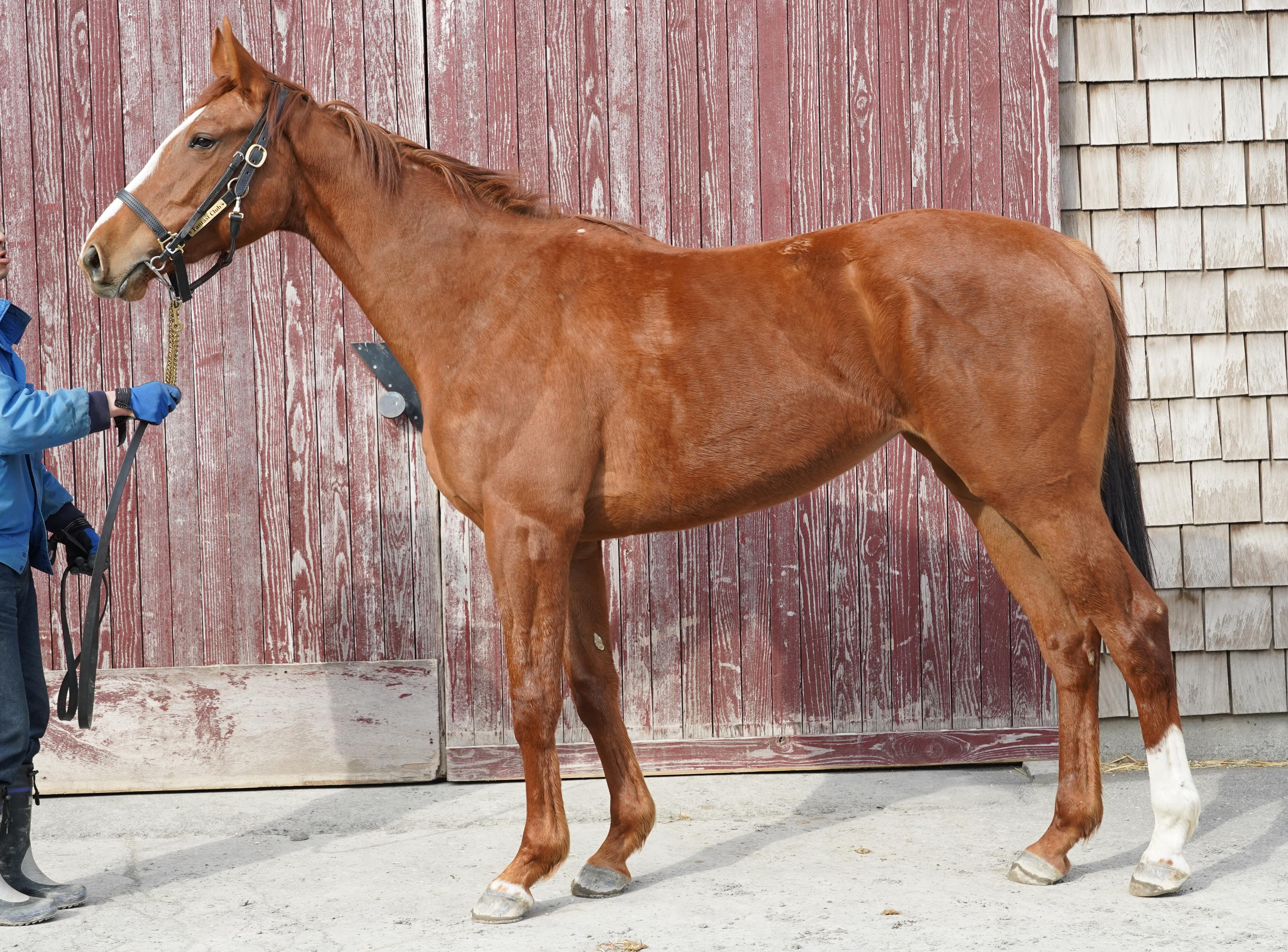 4/6 時点のアップワードスパイラルの2019の立ち写真になります。 4/6時点での馬体重483kgです。 本馬は現在募集中の2歳馬と同じタイミングで育成牧場(ファンタストクラブ)に移動し、ここまで全く同じ育成メニューを頓挫なく消化しております。現在は坂路15-15を消化して次の段階に進むところで、育成の一番苦しい時期を乗り越えて春先からの成長期を迎えるところにまできております。