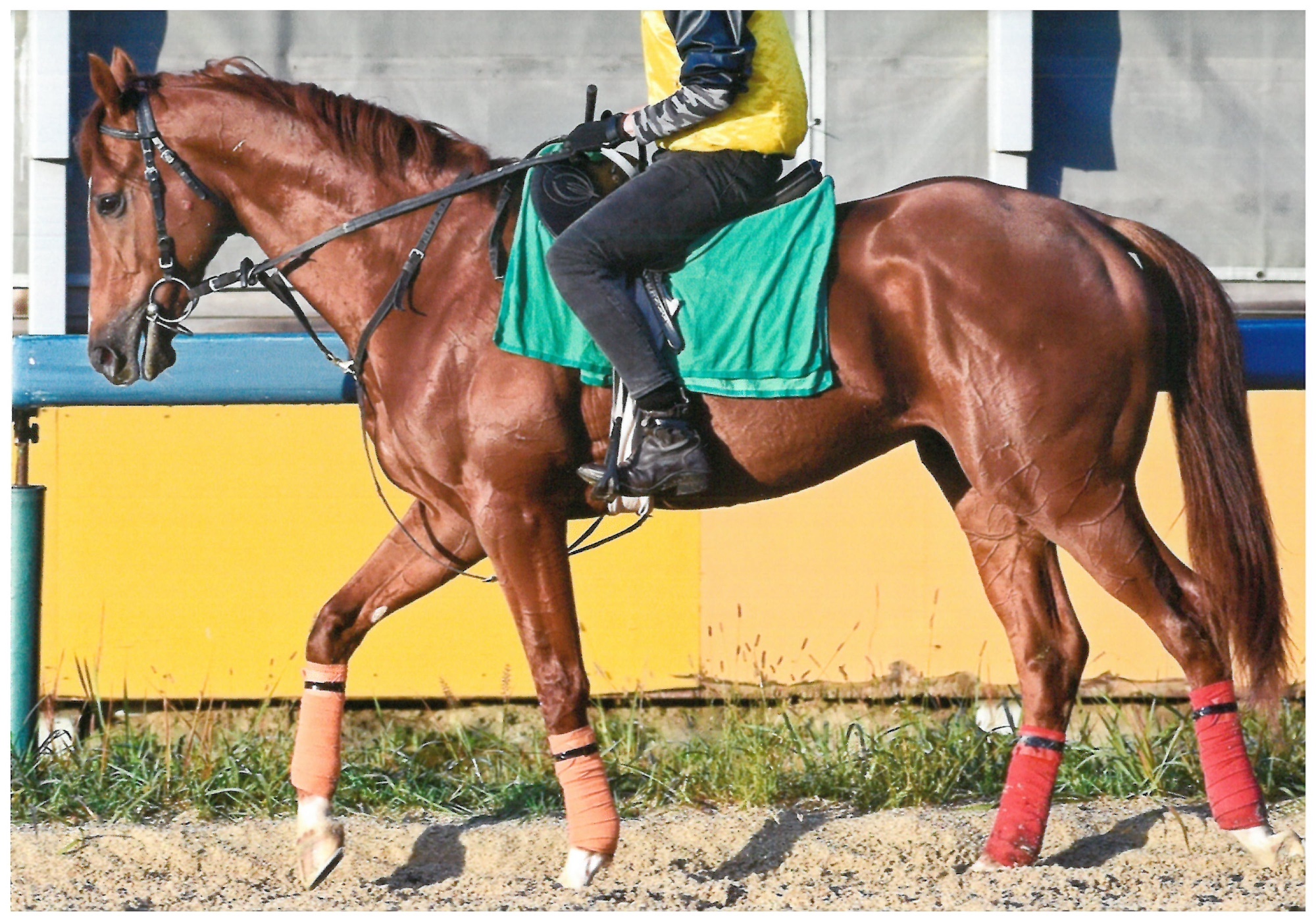 吉澤West:今週も馬場でハッキングから軽めのキャンターで2000mほど動かした後に坂路1本17~18/Fを中心に調教を行っており、先週末に坂路15-14、今週中間で坂路14-13を行いました。 こちらの環境にも慣れて、日々の調教には真面目に取り組んでおります。 バランスの良い馬体でフットワークも軽く、動けそうな気配がしています。普段の馬場でダクやハッキングの時には子供っぽい我の強さを見せるのですが、ギャロップに行くと集中してキビキビとした走りを見せていました。 調教師からも検疫などを調整して、遠くない時期にゲート試験を目標に入厩させる予定でいるとのことを伺っておりますので、指示があるまでしっかり乗って行きたいと思います。