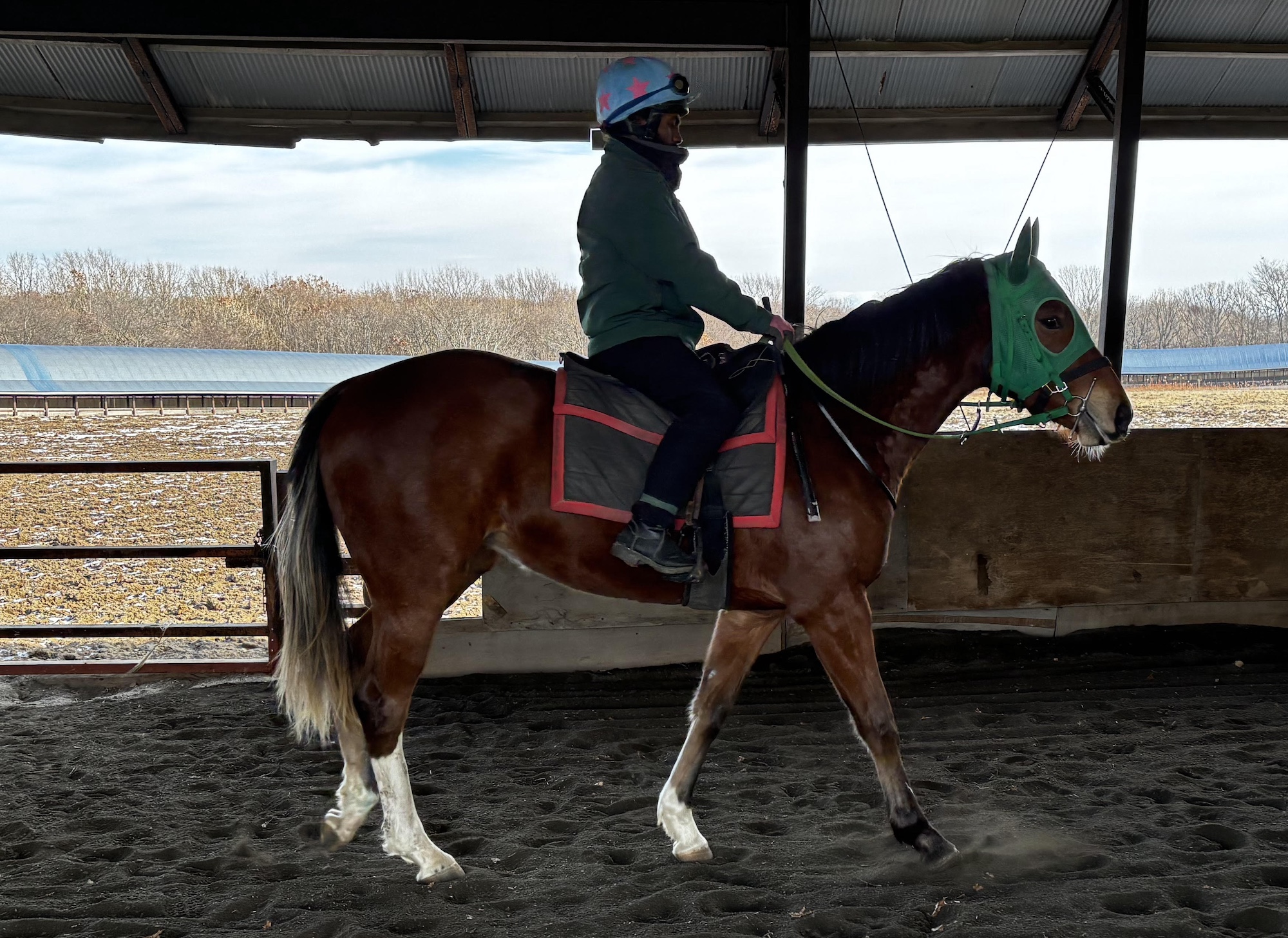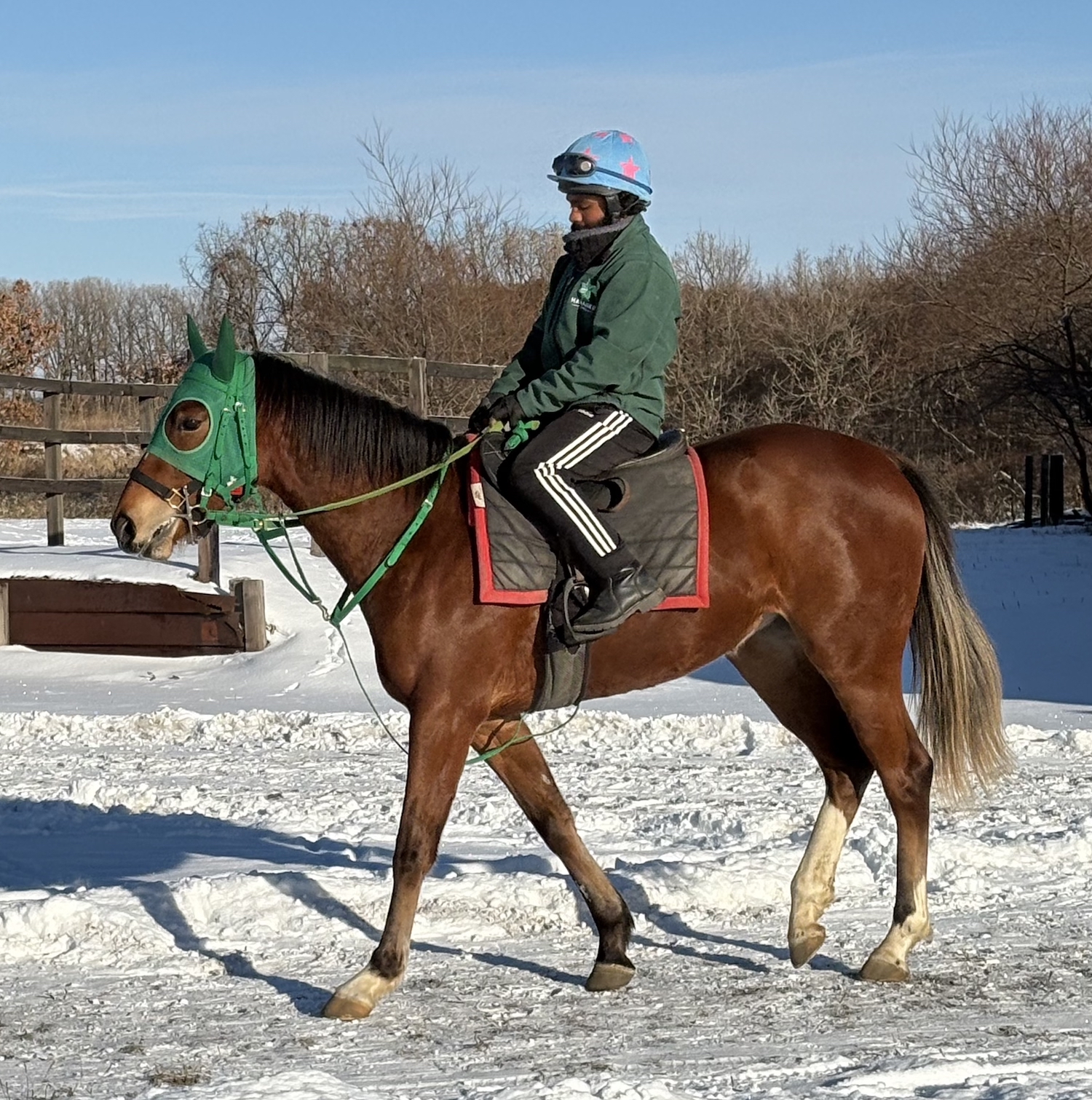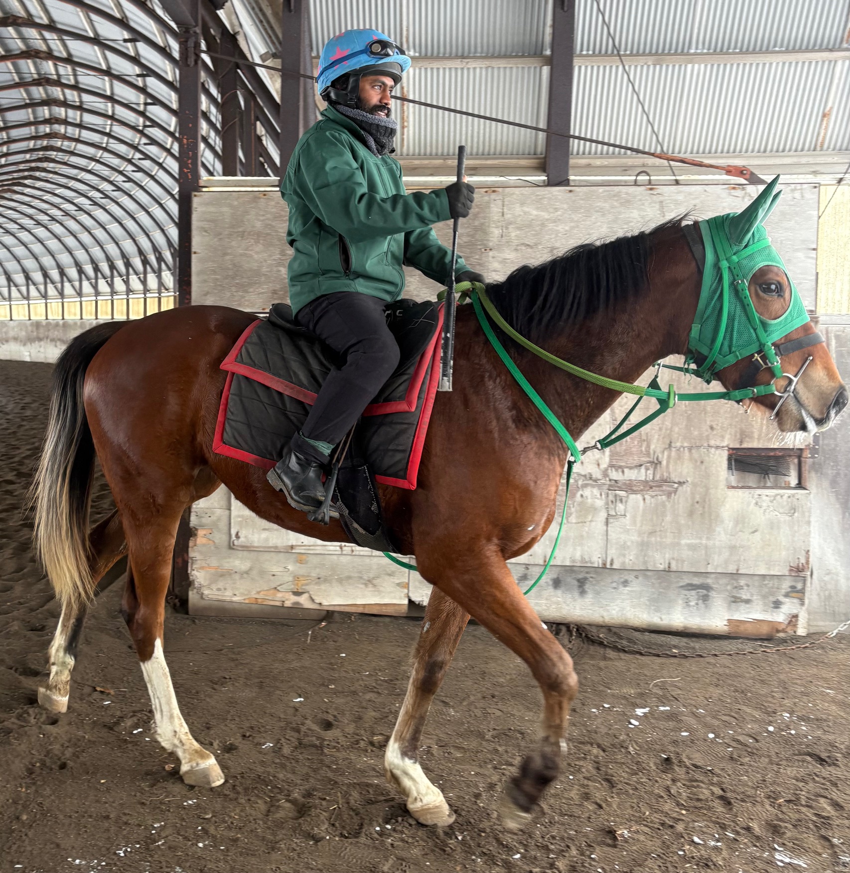 浜菊ファーム緑町育成場(仮):屋内ダートコースをウォーキングからダクで2000m、その後キャンターで2800m程度のメニューを行っております。 今週は厳しい寒さと雪道の中で屋内コースまでの移動になりましたが、環境の変化にも柔軟に対応できている印象です。 調教中も息を白くさせながら、若駒らしくエネルギッシュに取り組んでいます。個々の体調に合わせながら成長を促し、引き続き育成管理を行っていきます。