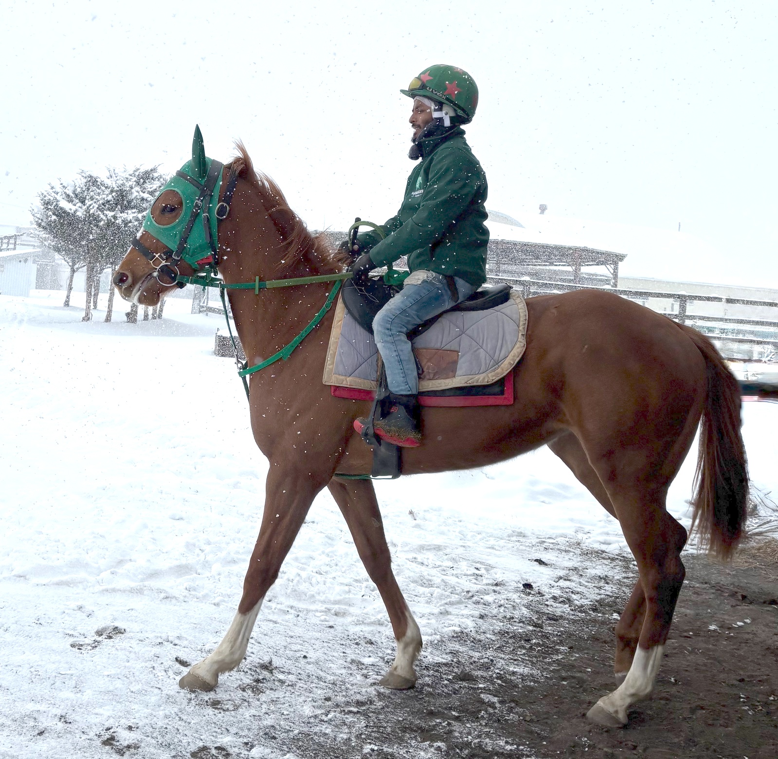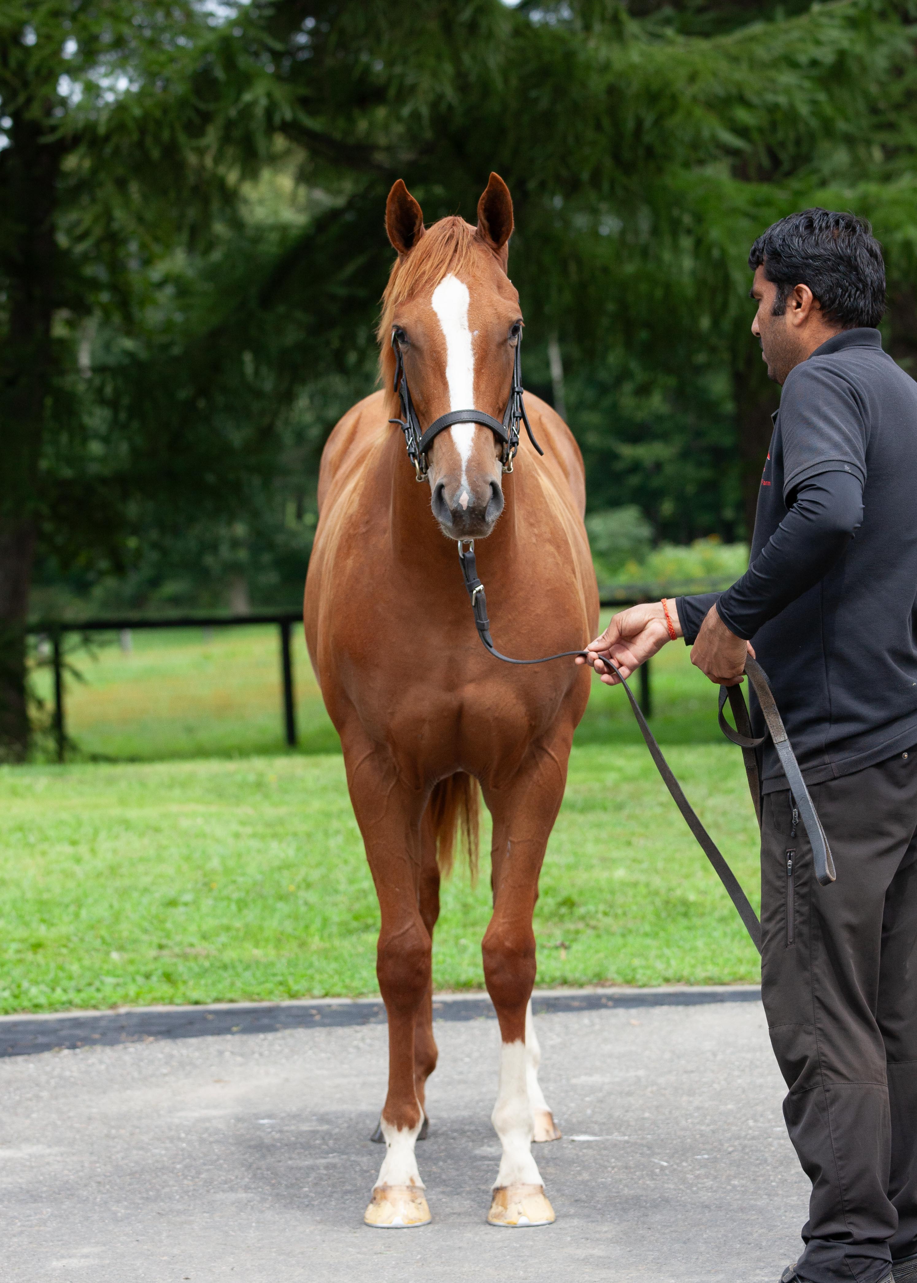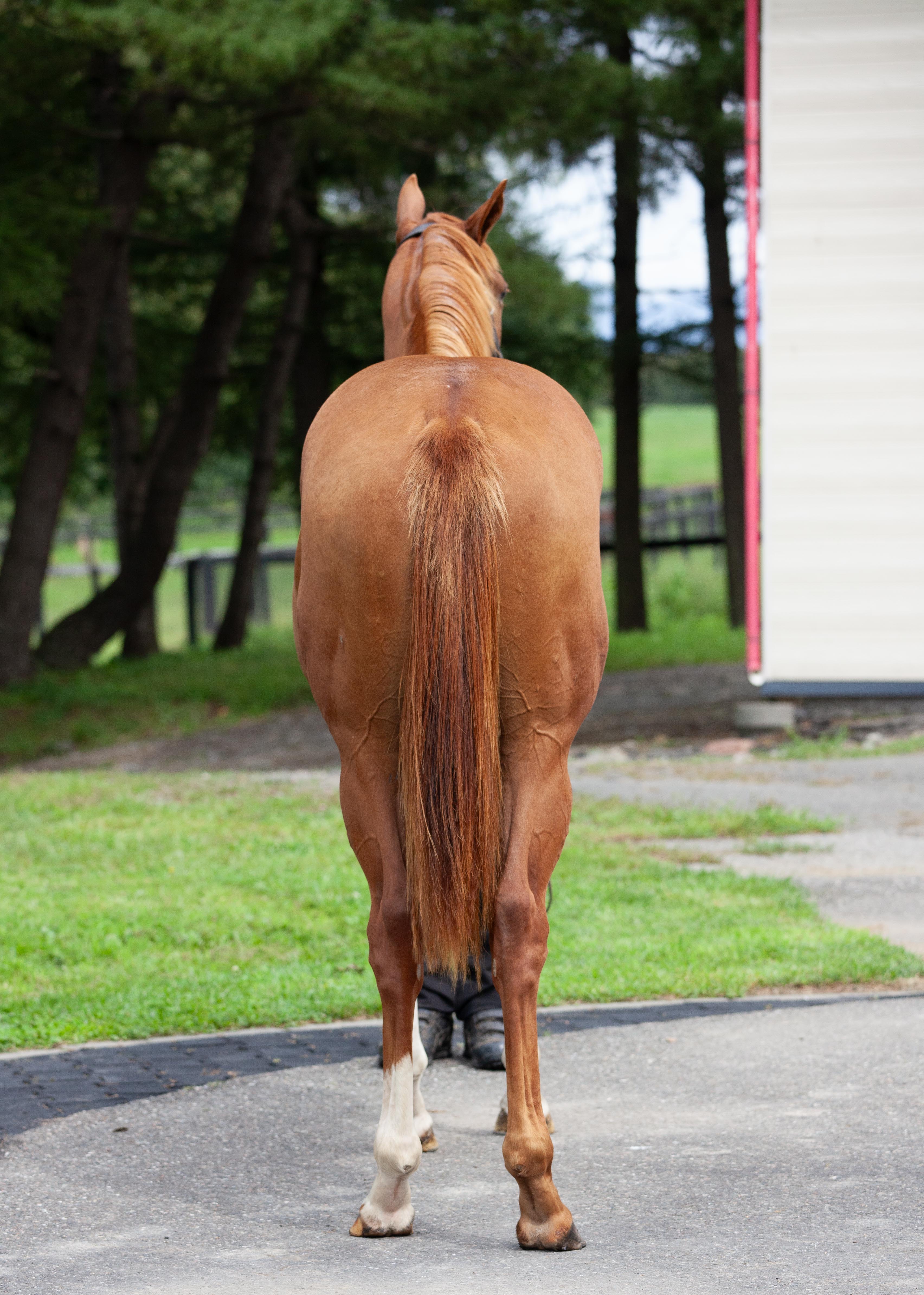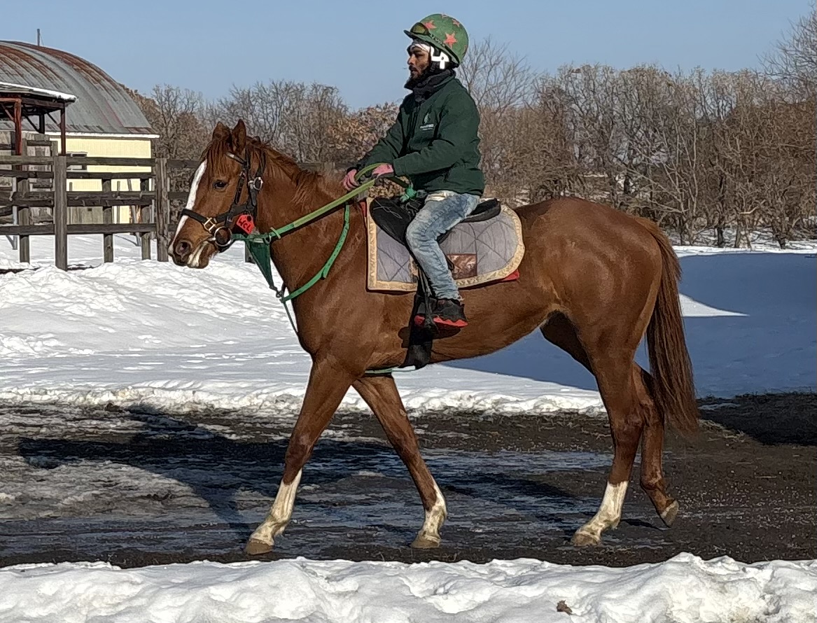 浜菊ファーム緑町育成場(仮):先週末に疝痛を起こし、獣医師の処置を受けています。 幸いにも軽度だったため、すぐに回復しています。 念のため血液検査を受けていますが、異常は見られませんでした。 その後の体調が安定していますので、今週は屋内ダートコースをウォーキングからダクで2000m、軽いキャンターで1500mの負荷の少ないメニューを行なっています。 寒さが厳しく体調を崩しやすい時期ですので、状態を確認しながら調教メニューを行なっていきます。 馬体重449kg